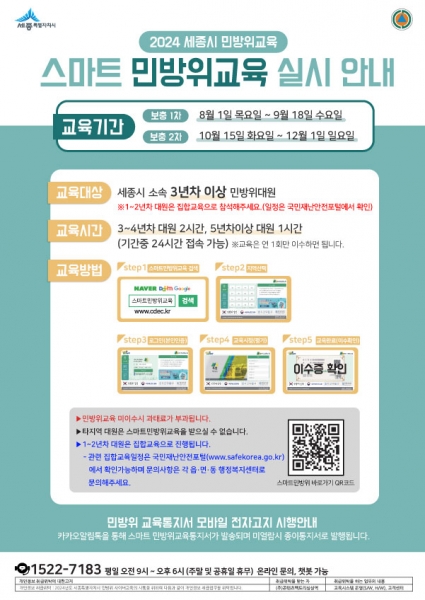 [Ytv영상스토리] 세종시가 민방위 사태 발생 시 즉각 대처하는 능력을 키우기 위해 1일부터 다음달 18일까지 2024년도 하반기 1차 민방위 사이버 및 집합교육을 실시한다.