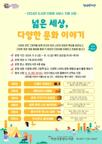 [Ytv영상스토리] 아산시 중앙도서관이 9월 6일부터 10월 11일까지 유아 대상 다문화 프로그램인 ‘넓은 세상, 다양한 문화 이야기’를 운영한다.