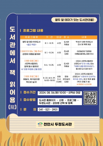 두정도서관 관계자는 “시민독서릴레이 선정도서를 다양한 방법으로 즐기면서 책 읽는 즐거움을 발견하고 천안시민의 독서 습관 형성에 도움이 되었으면 좋겠다”고 전했다.