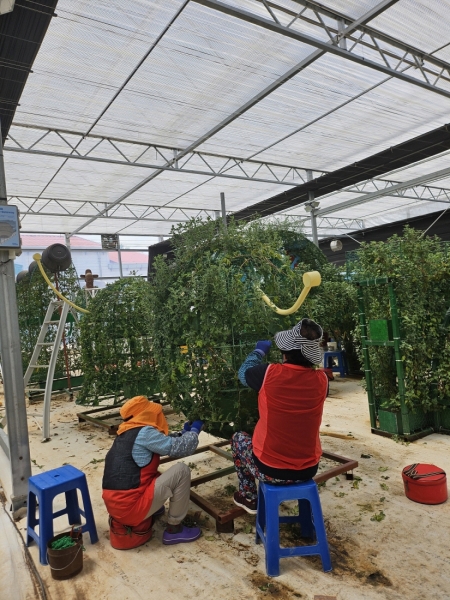 예산군농업기술센터 국화재배포장 조형물 국화 유인 작업 모습