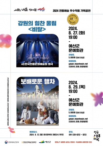 [Ytv영상스토리] 예산군문예회관은 문화체육관광부와 전통공연예술진흥재단의 전통예술 활성화 및 국악 저변확대를 위한 공모사업에 선정됐으며 전액 국비사업으로 대중성과 작품성을 인정받은 두 국악 작품을 군민들에게 선보일 예정이다.