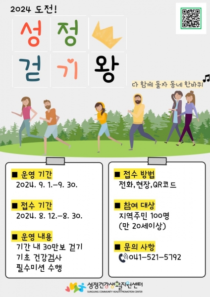 ‘2024 도전 성정 걷기왕’은 △필수 임무 수행△사전 기초건강검사 △30만 보 걷기 △사후 기초건강검사 △건강평가 및 상담까지 총 5단계로 구성되어 있으며 신체활동 참여를 독려하기 위해 참가자 전원에게 소정의홍보 물품이 제공될 예정이다.