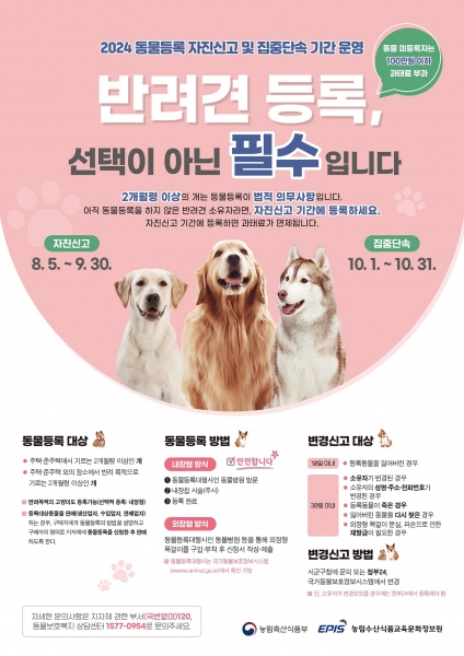임성복 대전시 농생명정책과장은 “반려동물 등록은 선택이 아닌 법적 의무사항”이라며 “반려동물을 잃어버렸을 경우 가장 빠르고 안전하게 찾는 방법이 내장형으로 동물등록을 하는 것으로 아직 동물등록을 하지 않은 시민들께서는 이번 자진신고 기간 내 신규 등록 및 변경 신고를 해달라”고 당부했다.