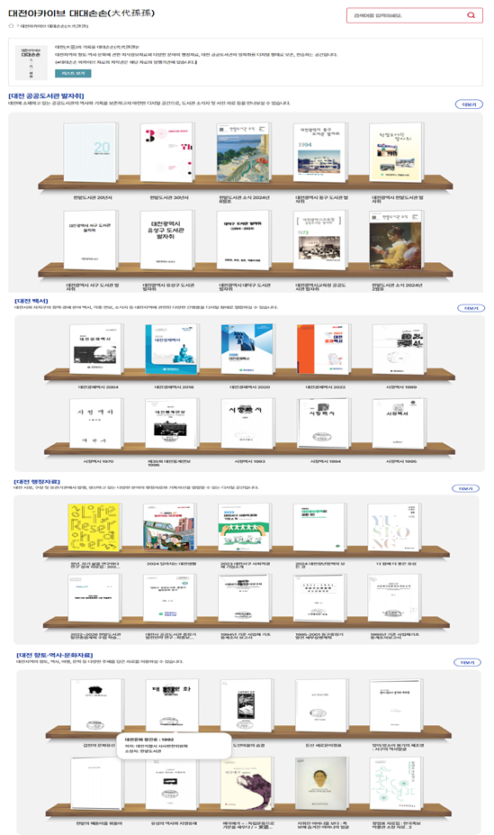 지금까지 구축한 자료는 총 400여 종으로 ‘대전 공공도서관 발자취’, ‘대전 백서’, ‘대전 행정자료’, ‘대전 향토·역사·문화자료’의 4개 분야를 중심으로 구성되어 있다.