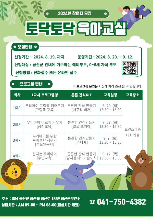 [Ytv영상스토리] 금산군보건소는 관내 예비부부 및 6세 이하 자녀를 둔 부모를 대상으로 8월 20일부터 9월 12일까지 2024년 하반기 토닥토닥 육아교실을 운영한다 교육 운영은 △8월 20일 – 우리아이 그림책 읽어주기 △8월 27일 – 우리아이 바르게 키우기 △9월 7일 – 우리 아이를 위한 육아철학 세우기 △9월 12일 – 잘 자는 우리아이 등으로 예정됐다.