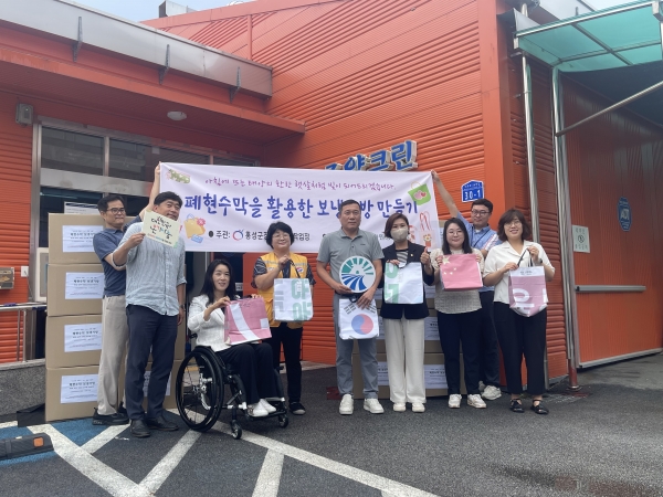 [Ytv영상스토리] 홍성군과 한국지체장애인협회 홍성군장애인보호작업장 조양크린이 폐현수막 재활용 프로젝트를 성공적으로 마무리하며 8일 폐현수막 보냉가방 전달식을 진행했다.