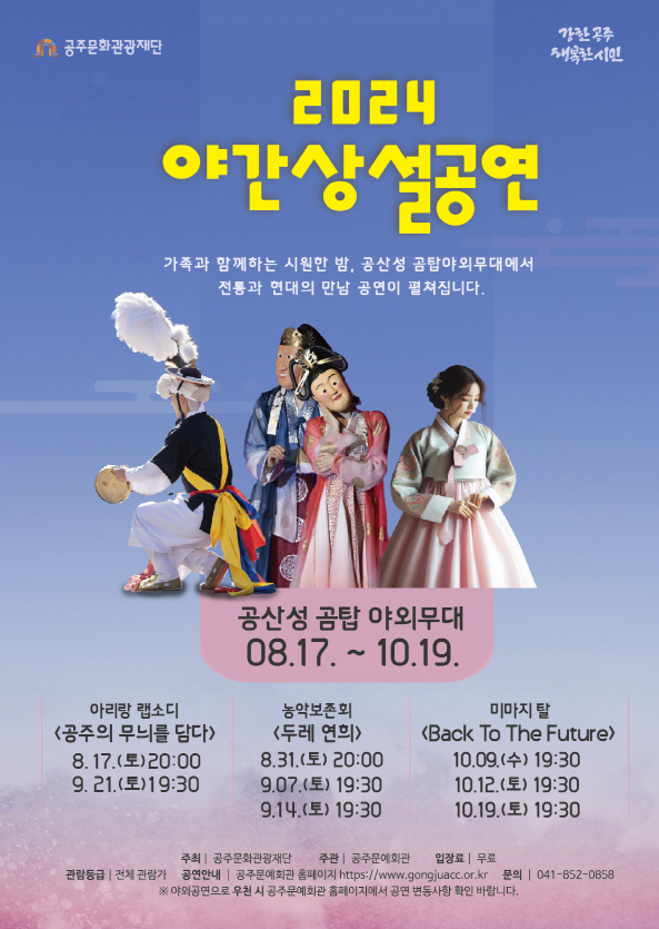 ‘아리랑 랩소디 공주의 무늬를 담다’ 공연은 8월 17일과 9월 21일 ‘두레 연희’ 공연은 8월 31일 9월 7일 9월 14일 ‘백제미마지탈 Back To The Future’는 10월 9일 10월 12일 10월 19일에 공산성 곰탑 야외무대에서 무료 공연으로 진행된다.