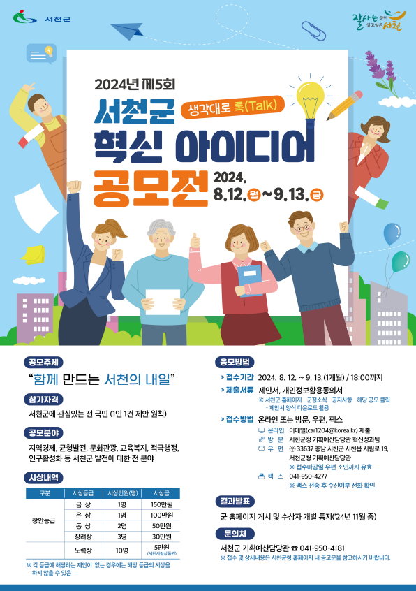신동순 기획예산담당관은 “이번 공모전을 통해 우수한 제안을 군정에 반영해 서천군민이 체감할 수 있는 혁신 행정을 실현하도록 노력하겠으며 군 발전에 관심 있는 많은 분들이 적극적으로 참여하기를 부탁드린다”고 말했다.