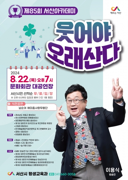 이번 서산아카데미는 ‘웃어야 오래 산다’를 주제로 건강의 비법인 웃음의 중요성에 대해 다룰 예정이다.