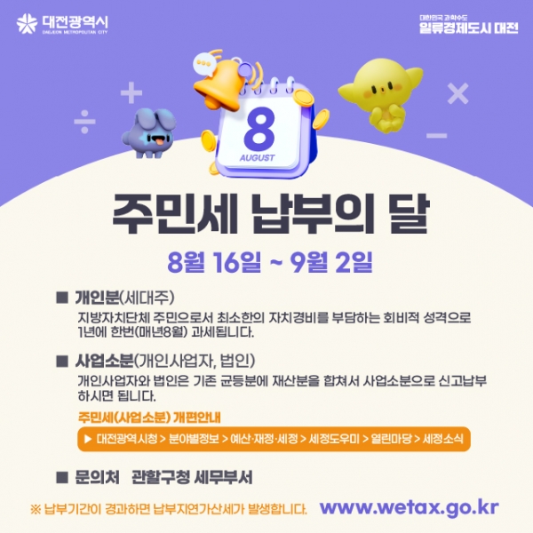 개인분 주민세 납부 대상은 7월 1일 기준으로 대전시에 주소를 둔 세대주이며 납부기한은 9월 2일까지이다.