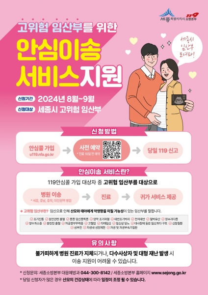 지역 내 고위험 임산부는 세종소방본부 누리집에서 사전 예약을 하면 누구나 안심 119이송서비스를 이용할 수 있다.