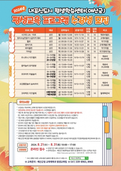 하반기 프로그램은 수강 모집 결과에 따라 9월 9일부터 10주간 운영되며 주민등록상 군민 누구나 1인 2강좌까지 신청이 가능하며 모든 강좌는 ’예산군 평생학습‘ 누리집에서 온라인 접수만 가능하다.