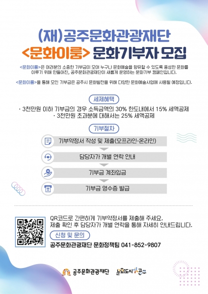 공주문화관광재단은 올해 공익법인으로 지정되어 기부자는 소득금액 30% 한도 내에서 15% 세액공제 혜택을 받을 수 있으며 기부금영수증을 발급 받을 수 있다.
