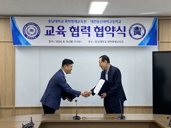 협약식에는 대전동신과학고등학교의 유상완 교장과 충남대학교 과학영재교육원의 오만호 원장이 참석해 상호 신뢰를 바탕으로 한 협력을 다짐했다.