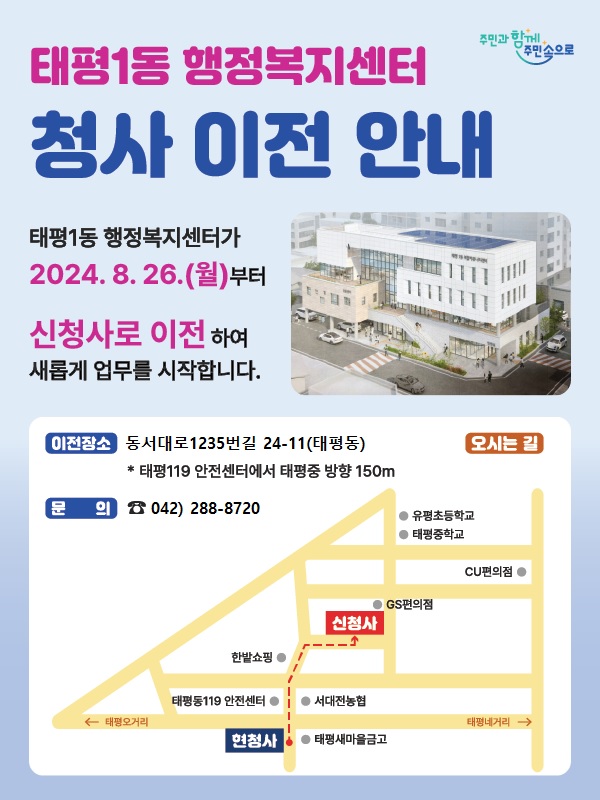 한편 지역주민들에게 신청사를 알리는 태평1동 복합커뮤니티센터 개청식은 9월 26일에 개최할 예정이다.