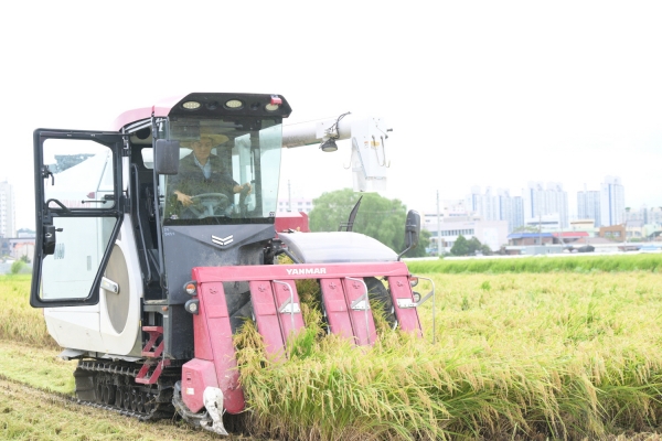 수확한 조생종 벼 ‘여르미’는 지난 5월 15일 모내기 후 얻은 결실로 3,815㎡에서 약 1,400kg의 햅쌀이 생산될 것으로 보인다.