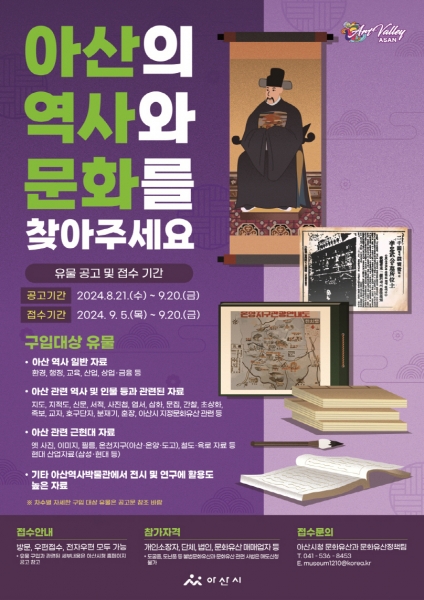 소유관계나 출처가 불분명한 자료는 구입 대상에서 제외되며 유물 매도신청 서류는 ‘아산시청 홈페이지-고시·공고 및 공지사항’을 통해 내려받을 수 있다.