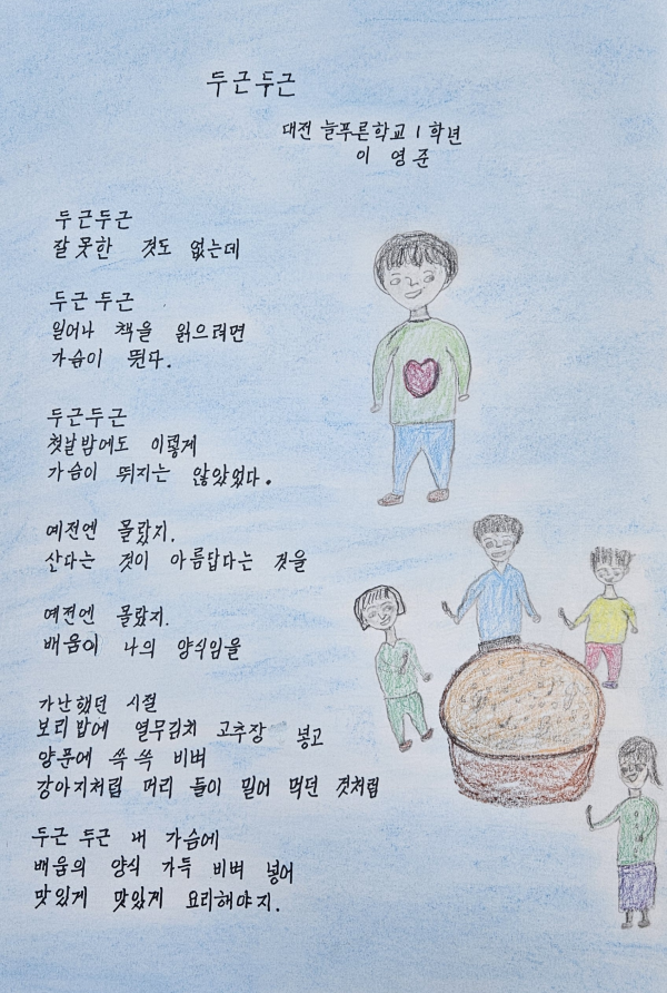 수상작‘두근두근’은 대전늘푸른학교를 다니면서 느낀 삶의 아름다움과 배움에 대한 설렘을 진솔하게 표현했다.