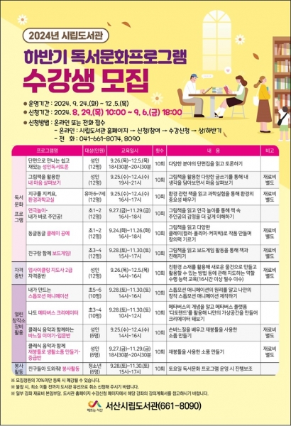 서산시립도서관 관계자는 “하반기 시민의 독서 생활 문화 촉진을 위해 다양한 시간대에 참여형 위주의 프로그램을 준비했다”며 “앞으로도 다양한 연령층이 참여할 수 있는 프로그램 기획에 최선을 다하겠다”고 말했다.