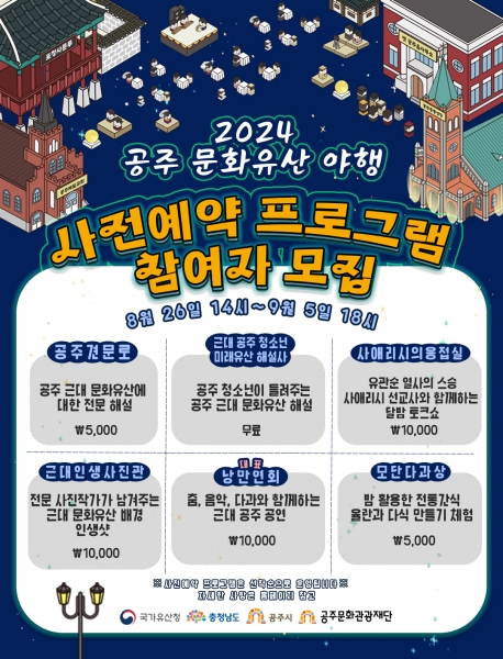사전예약 프로그램은 모두 온라인 사전신청을 통해 모집하며 공주 문화유산 야행 홈페이지에서 신청할 수 있다.