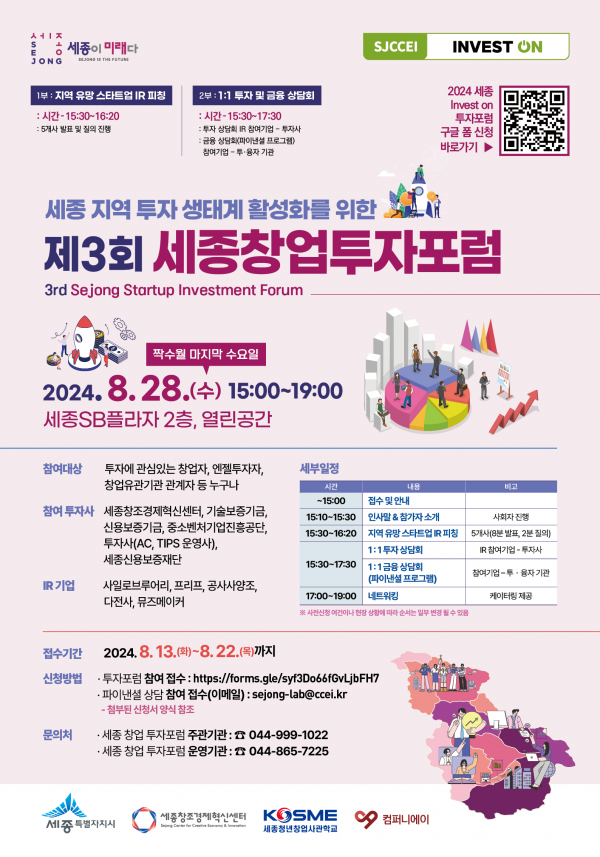 김현기 경제산업국장은 “세종 창업 투자포럼 활성화는 우리 시 창업기업들의 투자 유치에 큰 보탬이 될 것”이라며 “앞으로 포럼을 더욱 활성화해 청년 창업가들과 초기 기업들이 성장할 수 있는 환경을 조성하고 외부 투자 유치로 이어지는 선순환 구조를 구축하도록 하겠다”고 말했다.