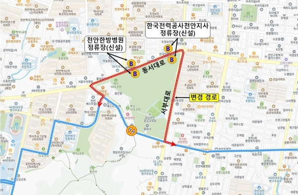 이번 노선 변경은 한국전력공사 천안지사와 대전대학교 천안한방병원 등의 공공기관과 병원을 찾는 시민의 편의성 향상을 위해 추진됐다.