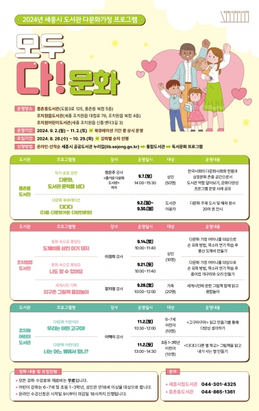 먼저 종촌동도서관에서는 오는 7일 ‘즐거운 다문화 도서관’의 저자 정은주 작가를 초청해 ‘다문화, 도서관 문턱을 넘다’를 진행한다.