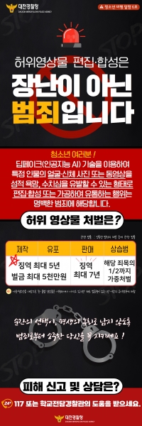 대전시교육청 양수조 미래생활교육과장은 “디지털 기술이 빠르게 발전하면서 범행 수법이 점점 구체화·체계화되고 있을 뿐 아니라, 학생들이 스마트폰은 물론 태블릿, 컴퓨터 등 일상생활에서 광범위하게 디지털 기기를 사용하고 있는 만큼 디지털 성폭력의 위험에 노출될 가능성이 높다”며 “딥페이크 기술을 이용해 허위영상물을 편집하거나 합성하는것은 단순한 장난이 아닌 가짜 정보와 허위사실을 퍼뜨리는 중대한 범죄인만큼 경찰청과 긴밀한 협력을 통해 철저히 대응하는 데 최선을 다하겠다”고 말했다.