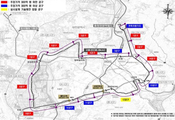 14개 공구 노선 공사와 별도로 트램 차량의 유치, 검수, 정비와 운행 제어·감시·통제 등 관제 기능을 수행하는 대덕구 연축동 차량기지 건설공사의 경우 건축, 토목을 포함해 678억원 규모의 단일 공구로 발주된다.