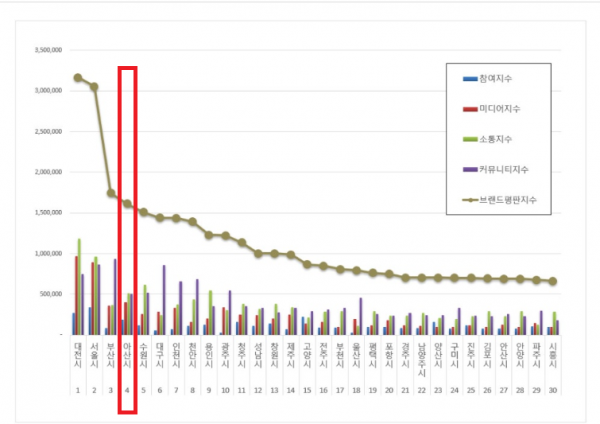 아산시는 지난 5월 4위 기록 당시, 인구 100만이 넘는 수도권 도시들을 제치고 비수도권 39만명 인구의 중소도시로서는 이례적인 성과를 이뤘다는 평을 받은 바 있다.