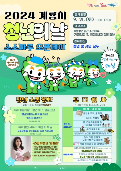 시는 2020년도부터 매년 9월 셋째 주 토요일을 청년의 날로 지정·운영하고 있으며 올해는 9월 21일 계룡시 청년공간 소소마루에서 ‘소소마루 오픈데이’라는 주제로 오전 11시부터 오후 5시까지 열린다.