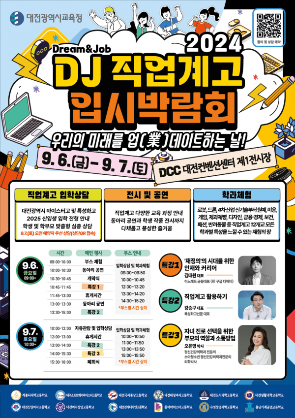 대전시교육청 관계자는 “직업교육은 학생들과 직업 세계를 연결하는 교육으로 큰 의미를 갖고 있다”며 “이번 DJ 직업계고 입시박람회를 통해 대전 관내 우수한 직업계고등학교가 널리 알려지는 한편 학부모님들은 자녀들의 꿈과 희망을 응원해 줄 수 있는 계기가 되기를 바란다”고 말했다.