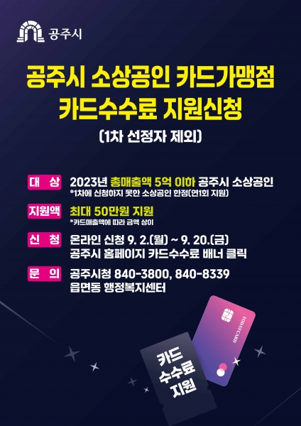 9월부터 2차로 카드수수료 지원 신청을 받을 예정으로 대상은 1차에 신청하지 못한 소상공인 중 2023년 연 매출 5억원 이하인 관내 소상공인이다.