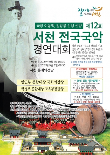 근대 5대 명창인 서천 출신 이동백, 김창룡 선생을 선양하고 국악 인구의 저변 확대 및 국악 활성화를 위해 매년 개최하고 있는 이번 대회는 올해 ‘중고제 판소리’, ‘전통무용’, ‘전통연희’ 분야가 새롭게 신설되어 전국의 국악인들이 대거 참여할 예정이다.