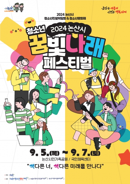 논산시는 5일부터 7일까지 청소년들이 진로와 미래에 대한 고민을 나누고 마음껏 즐길 수 있는 시간을 만들어 주기 위한 ‘2024 논산시 청소년 꿈빛나래 페스티벌’을 개최한다.