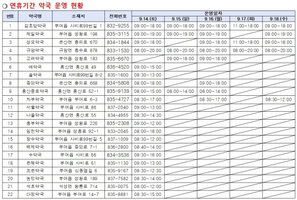 연휴 기간 의료 공백을 방지하기 위해 지역응급의료기관인 건양대학교 부여병원은 24시간 응급실을 운영하며 관내 22개 병·의원과 22개 약국은 ‘문 여는 병·의원 및 약국’ 으로 지정되어 운영된다.