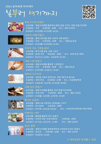 △필사의 즐거움을 느낄 수 있는 ‘문학이 사각사각’ △목공예, ‘서체 의자 만들기’ △캔버스에 반려동물 그리기, ‘빛나는 눈동자’ △폐유를 활용한 비누 만들기, ‘쓰레기는 가라’ △ 천연염색 티셔츠를 만드는 ‘부여, 걸쳐’ 등의 프로그램에 참여할 수 있다.