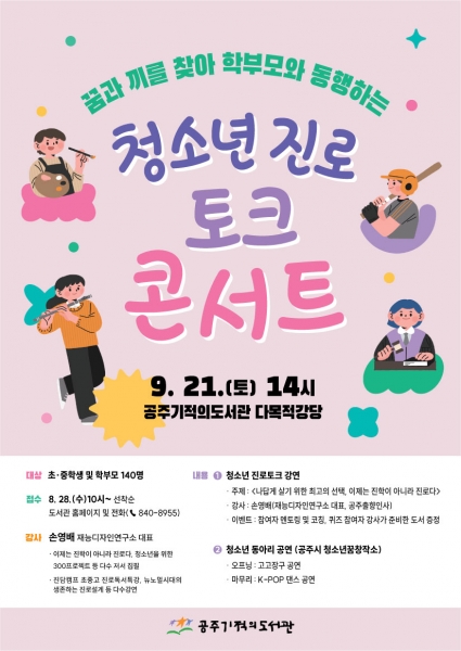 진로토크 콘서트에 참여를 원하는 학생 및 학부모는 8월 28일 오전 10시부터 공주시도서관 누리집 또는 전화로 신청하면 된다.
