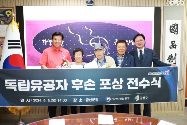 박범인 금산군수는 “인생의 가장 빛나는 시기에 자신의 전부를 조국에 바치신 독립유공자님의 헌신과 희생에 경의를 표한다”며 “강만희 대전지방보훈청장님과 함께 포상을 전수하게 돼 기쁘다”고 말했다.