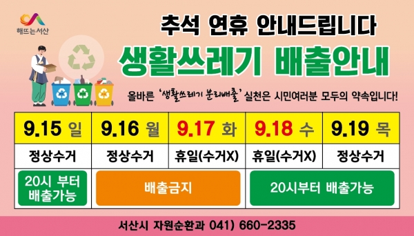 연휴 기간 시민들은 9월 15일과 18일 19일 저녁 8시 이후에 기존 배출 장소에 생활 쓰레기를 배출하면 된다.