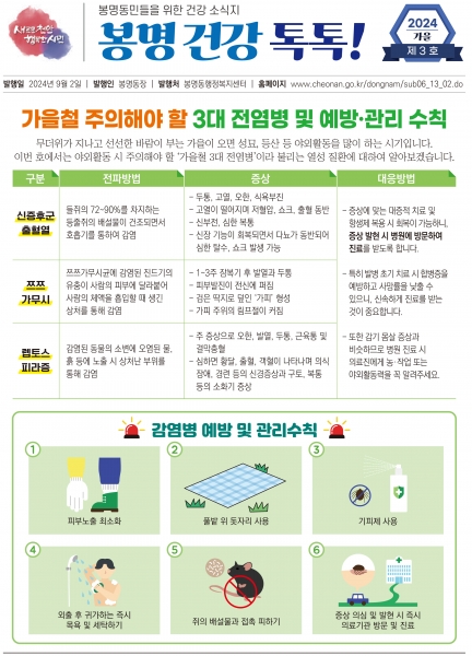 이번 소식지에는 가을철 주의해야 할 3대 전염병인 신증후군출혈열, 쯔쯔가무시, 렙토스피라증에 대한 설명과 예방·관리 수칙 및 ‘변실금에 대한 오해’를 주제로 한 건강 칼럼을 담았다.