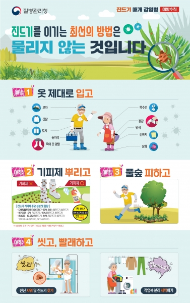 진드기 매개 감염병 예방수칙은 △야외활동 전 밝은 색 긴 팔, 긴 바지, 모자, 양말, 신발 등 노출을 최소화할 수 있는 복장 갖춰 입기 △진드기 기피제 사용하기 △야외활동 중 풀밭에 앉을 때 돗자리 사용하기 △풀밭에 옷 벗어놓지 않기 △야외활동 후 옷은 털어서 세탁하기 등이다.