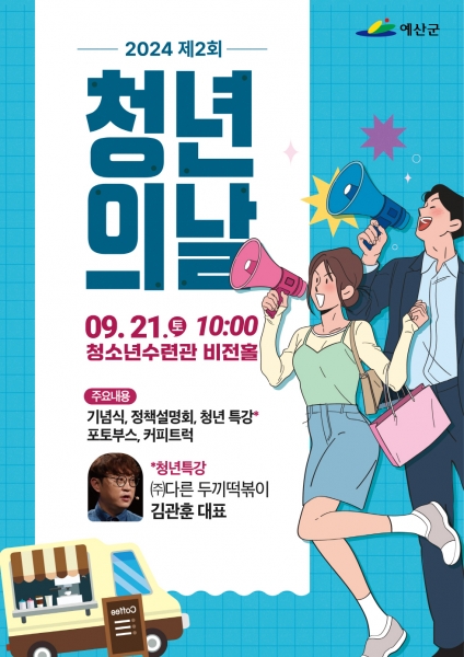 1부에는 지역예술인의 식전공연을 시작으로 청년의 날 기념식이 진행되며 2부에는 군에서 추진하고 있는 다양한 청년정책을 설명하는 청년정책설명회와, 글로벌 프랜차이즈 두끼 떡볶이 김관훈 대표가 ‘여러분은 자신의 이야기를 나눠본 적 있나요?’를 주제로 실패와 성공 스토리를 들려주는 초청 강연 자리도 마련했다.