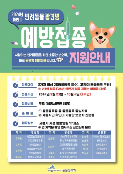 협력 동물병원 목록은 세종시청 누리집 공지사항에서 확인할 수 있고 면 지역 주민의 경우 해당 지역 행정복지센터 산업 담당을 통해 신청하면 출장 접종도 가능하다.