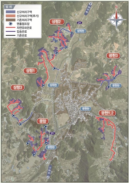 ‘광천 하수관로 정비사업’은 광천읍 담산리, 소암리, 상정리, 은하면 장척리 일부지역을 공공하수처리구역으로 확장하는 대규모 사업으로 해당 사업을 통해 오수관로 22km를 매설하고 하수의 원활한 흐름을 위한 맨홀 펌프 14개소를 설치해 523세대의 생활오수를 처리하게 된다.