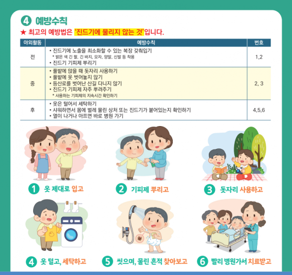 또한 △진드기를 발견하기 쉽도록 밝은색 옷을 착용하고 △풀베기 작업 후에는 목욕하기, 옷 갈아입기 등 예방수칙을 준수해야 한다.