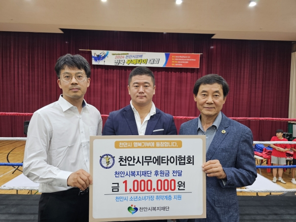 [Ytv영상스토리] 천안시무에타이협회는 지난 21일 제19회 소년·소녀 가장 돕기 2024 천안시장배 무에타이대회에서 천안시복지재단에 후원금 100만원을 전달했다고 밝혔다.