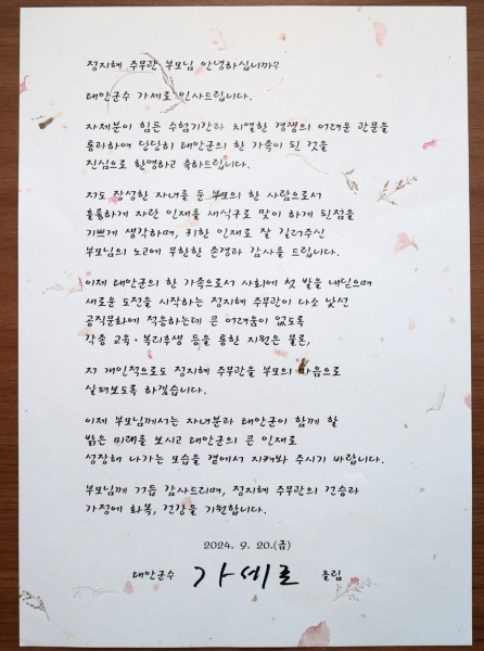 가 군수는 서한문을 통해 “훌륭하게 자란 인재를 새식구로 맞이하게 된 점을 기쁘게 생각하며 귀한 인재로 잘 길러주신 부모님의 노고에 무한한 존경과 감사를 드린다”고 언급했다.