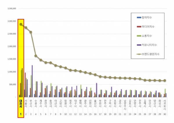 1위를 차지한 대전시는 참여지수 97,509, 미디어지수 559,020, 소통지수 1,082,076, 커뮤니티지수 1,150,587이 되면서 브랜드 평판지수 2,889,191으로 분석됐다.