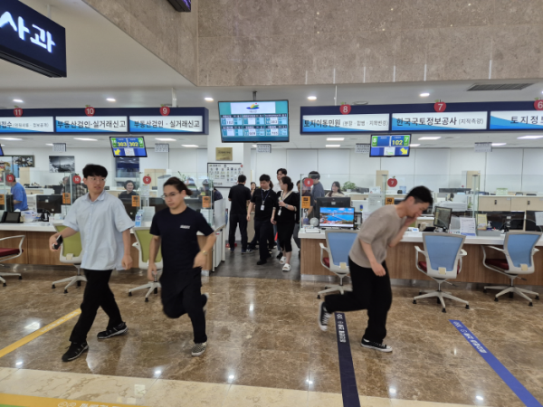 특히 청사 내 화재 발생에 따른 비상상황 대처 능력을 향상하기 위해 최초 발견자의 신속한 상황전파와 대피, 화재진압 훈련을 실시했다.